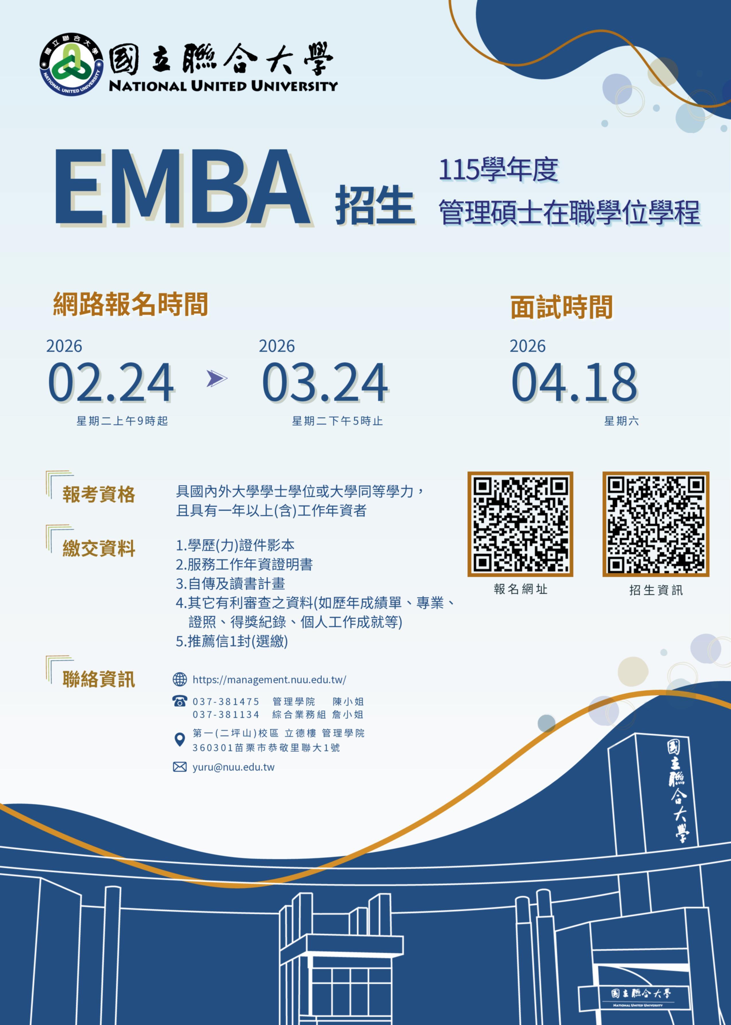 115學年度碩士在職專班招生簡章115學年度管理碩士在職專班(EMBA)招生資訊